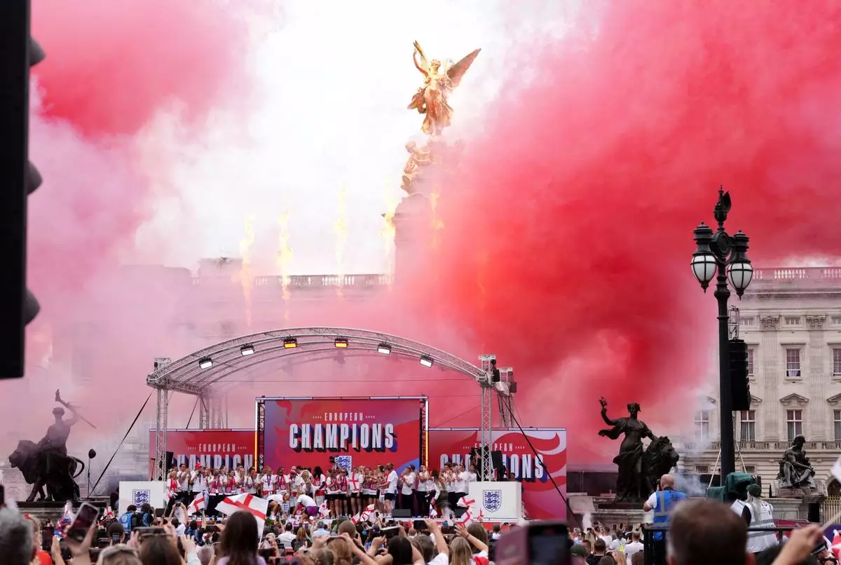 England players celebrate in central London, Tuesday, July 29, 2025 after their victory in the Women's EURO 2025 final. (Adam Davy, Pool Photo via AP)