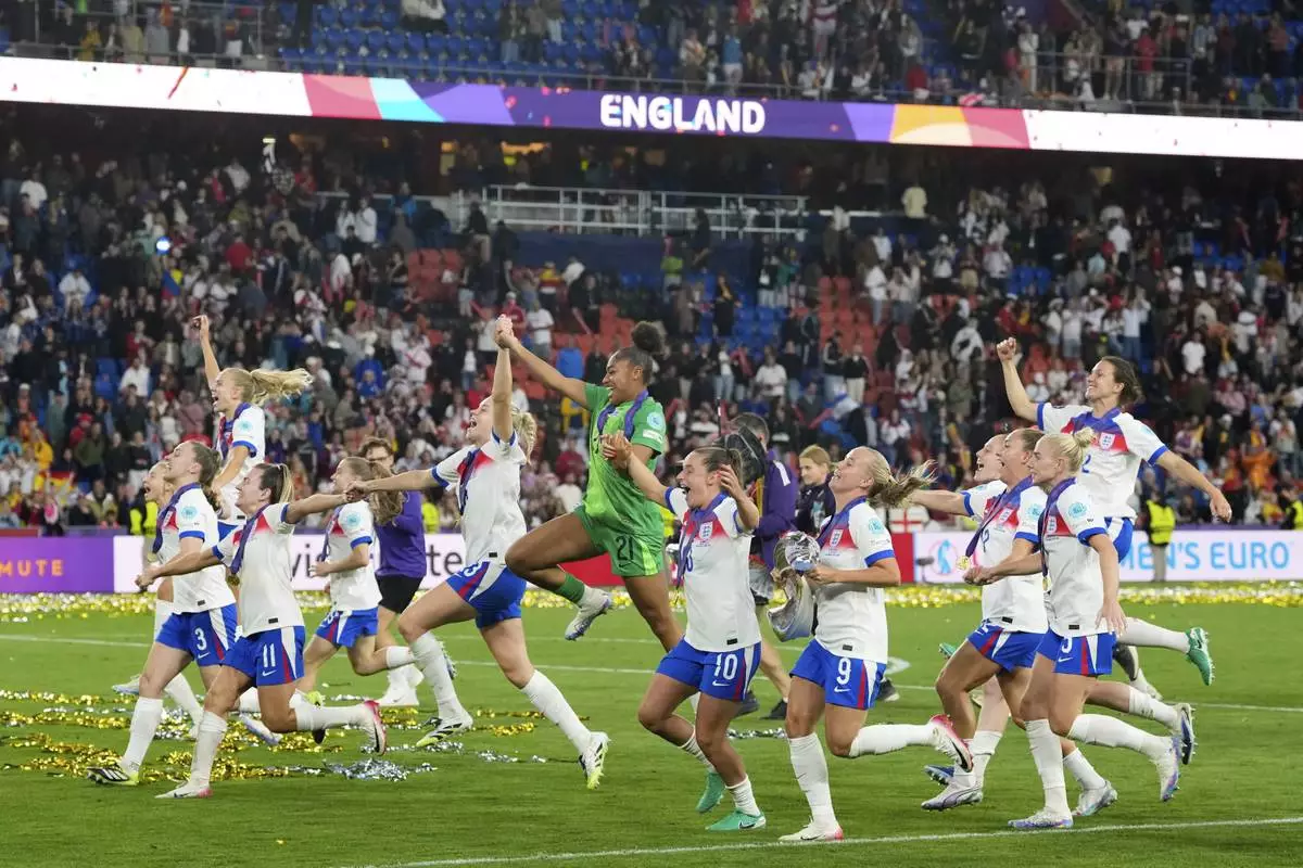 England players celebrate with the trophy after winning the Women's Euro 2025 final soccer match between England and Spain at St. Jakob-Park in Basel, Switzerland, Sunday, July 27, 2025. (AP Photo/Alessandra Tarantino)