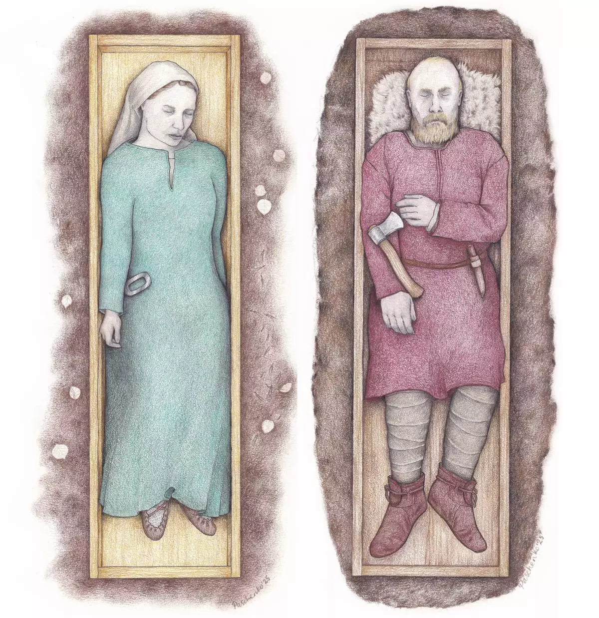 The woman’s grave in Vilusenharju, Tampere was discovered in 1962, and the man’s grave in Ristiänmäki, Pälkäne in 1982. Ancient DNA research has now revealed that the deceased were siblings. Illustrations by Veronika Paschenko. Photo by Vapriikki.