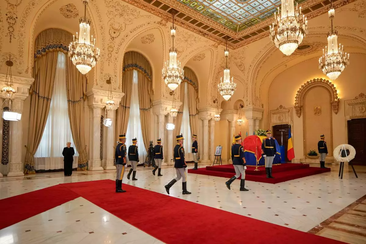 Honor guard soldiers perform a changing of the guard by the coffin of late Ion Iliescu, Romania's first freely elected president after the fall of communism in 1989, at the Cotroceni Presidential Palace, in Bucharest, Romania, Wednesday, Aug. 6, 2025.(AP Photo/Vadim Ghirda)