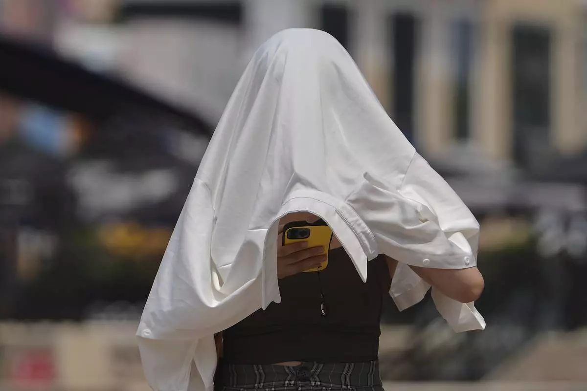 FILE - A woman covers herself from the sun as she browses a smartphone on a street during a hot day in Beijing, Wednesday, July 23, 2025. (AP Photo/Andy Wong, File)