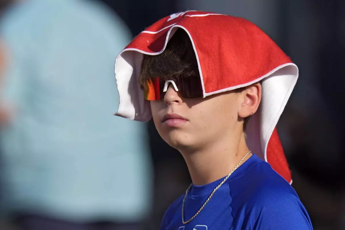 FILE - A young Tampa Bay Buccaneers fan covers his head to avoid the sun and heat during Back Together Weekend at an NFL football training camp practice Sunday, July 27, 2025, in Tampa, Fla. (AP Photo/Chris O'Meara, File)