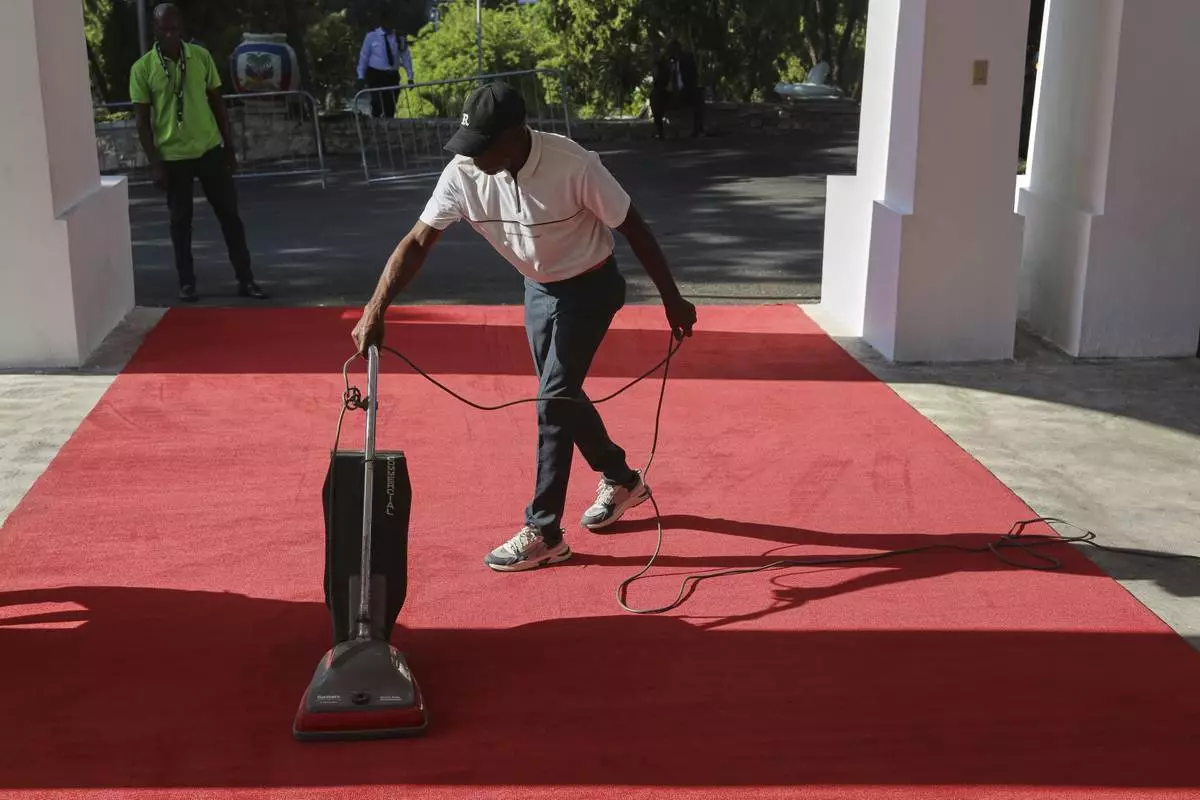 A worker cleans the red carpet for the installation ceremony of Laurent Saint-Cyr, who replaces Fritz Alphonse Jean, for the rotating presidency of the transitional presidential council in Port-au-Prince, Haiti, Thursday, Aug. 7, 2025. (AP Photo/Odelyn Joseph)