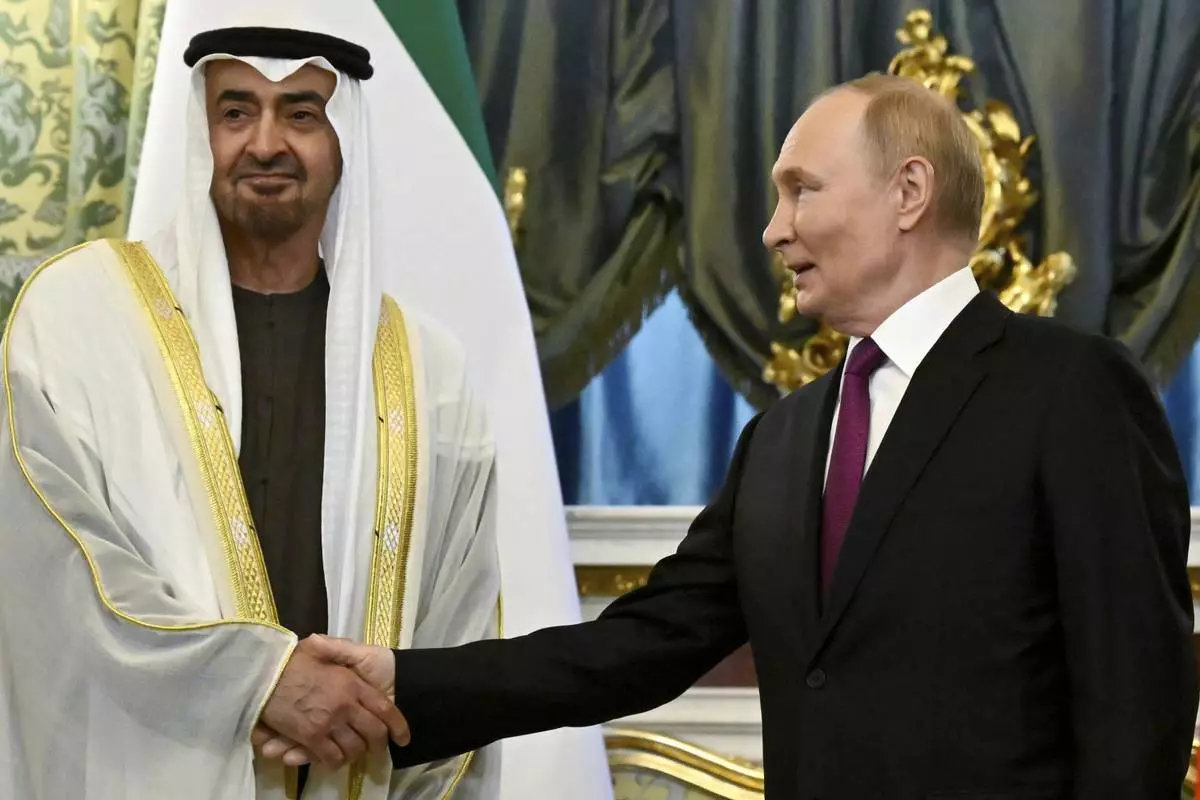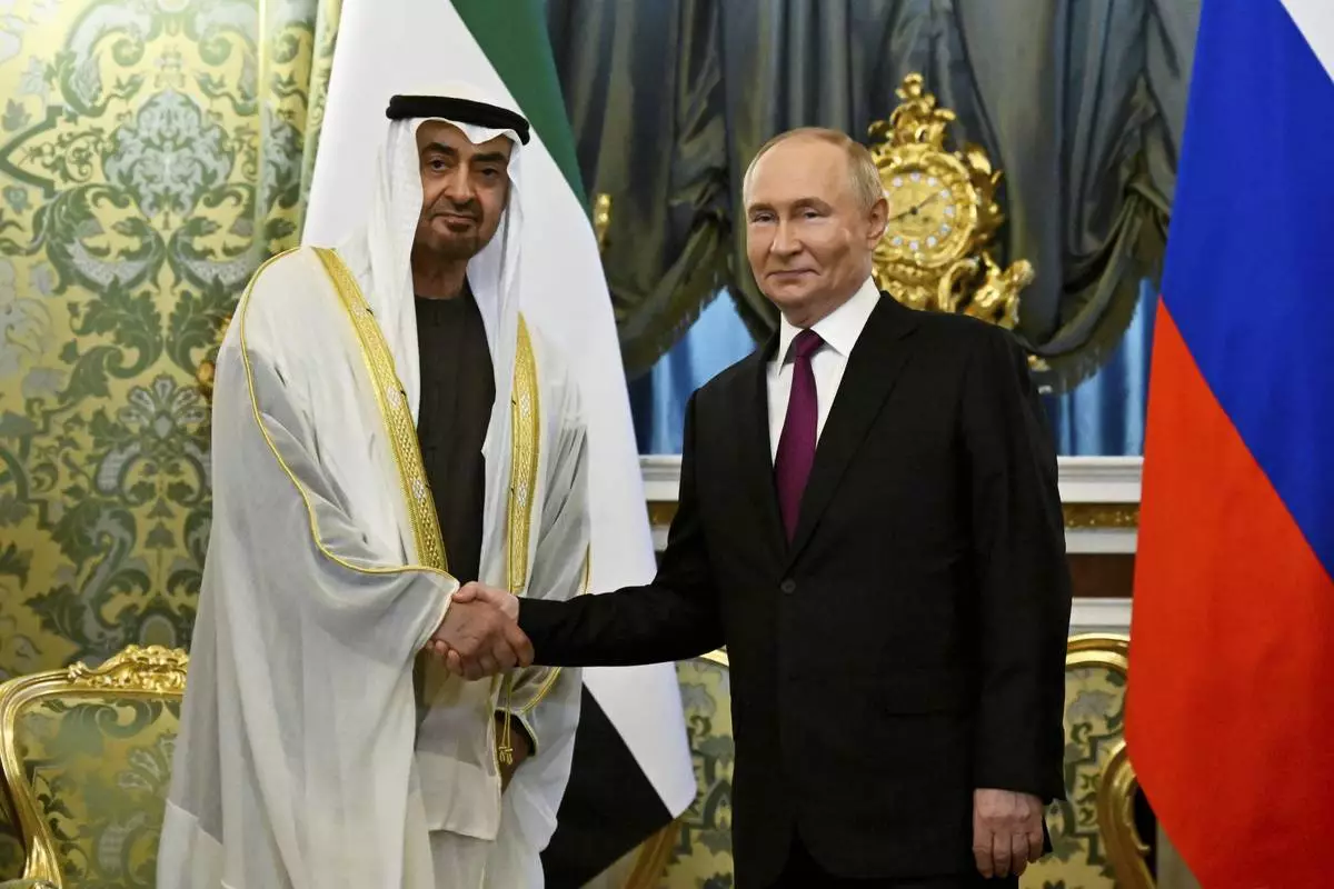 Russian President Vladimir Putin, right, and United Arab Emirates President Sheikh Mohammed bin Zayed Al Nahyan shake hands during their meeting at the Grand Kremlin Palace in Moscow, Russia, Thursday, Aug. 7, 2025. (Alexander Nemenov/Pool Photo via AP)