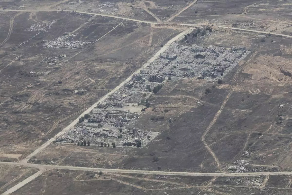 Destroyed buildings in the Gaza Strip are seen from a Jordanian Air Force C-130 plane during an airdrop of humanitarian aid for Palestinians, Thursday, Aug. 7, 2025. (AP Photo/Raad Adayleh)