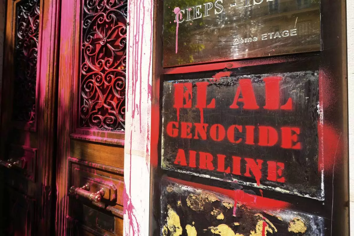 Red paint and the words “El Al genocide airline” were sprayed across the glass doors and walls of the airline’s office.