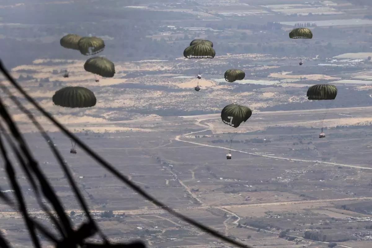 Containers of humanitarian aid are airdropped to Palestinians in the Gaza Strip from a Jordanian Air Force C-130 plane, Thursday, Aug. 7, 2025. (AP Photo/Raad Adayleh)