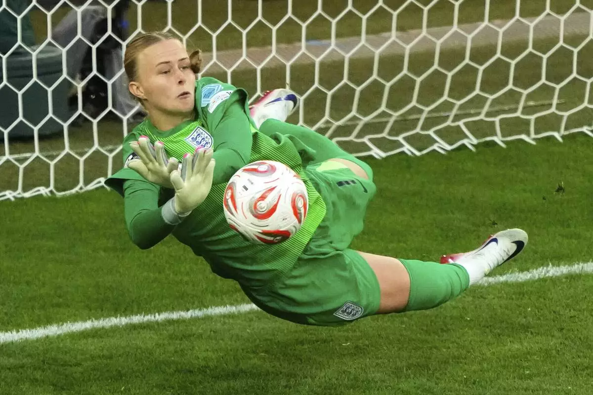FILE - England goalkeeper Hannah Hampton stops a shot from Spain's Aitana Bonmati during a penalty shootout at the end of the Women's Euro 2025 final soccer match between England and Spain at St. Jakob-Park in Basel, Switzerland, Sunday, July 27, 2025. (AP Photo/Michael Probst, File)