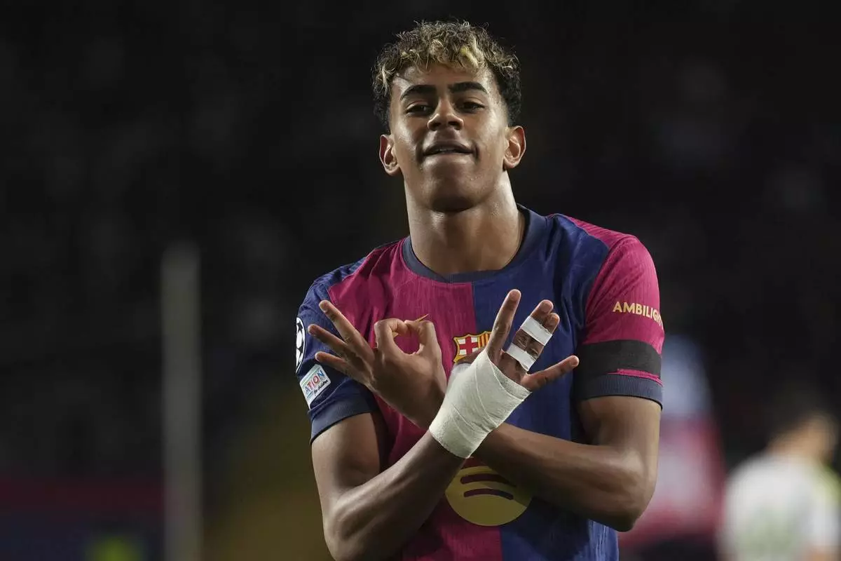 FILE - Barcelona's Lamine Yamal celebrates after scoring his side's second goal during the Champions League round of 16 second leg soccer match between FC Barcelona and SL Benfica at the Lluis Companys Olympic Stadium in Barcelona, Spain, Tuesday, March 11, 2025. (AP Photo/Emilio Morenatti, File)