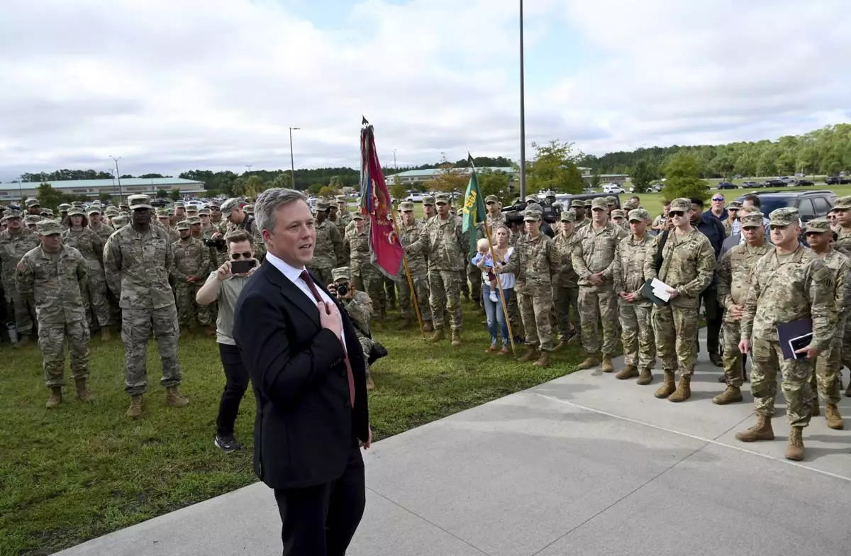 Army Secretary Dan Driscoll expresses his gratitude as he arrives to honor six soldiers for their heroic actions and for a news conference outside Fort Stewart in Georgia, Thursday, Aug. 6, 2025. (Hyosub Shin /Atlanta Journal-Constitution via AP)