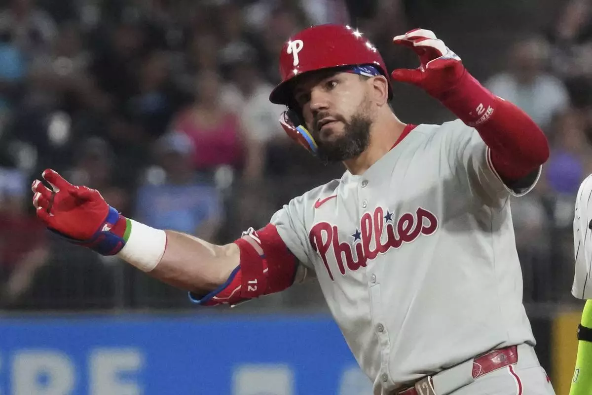 Philadelphia Phillies' Kyle Schwarber celebrates after hitting a double during the seventh inning of a baseball game against the Chicago White Sox in Chicago, Tuesday, July 29, 2025. (AP Photo/Nam Y. Huh)