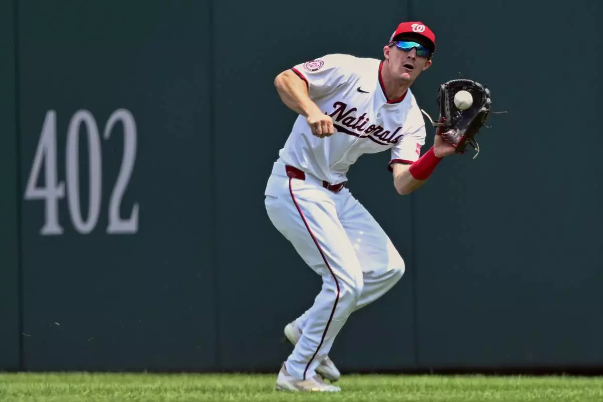Washington Nationals center fielder Jacob Young catches a deep fly ball hit by the Athletics' Shea Langeliers during the first inning of a baseball game Thursday, Aug. 7, 2025, in Washington. (AP Photo/John McDonnell)