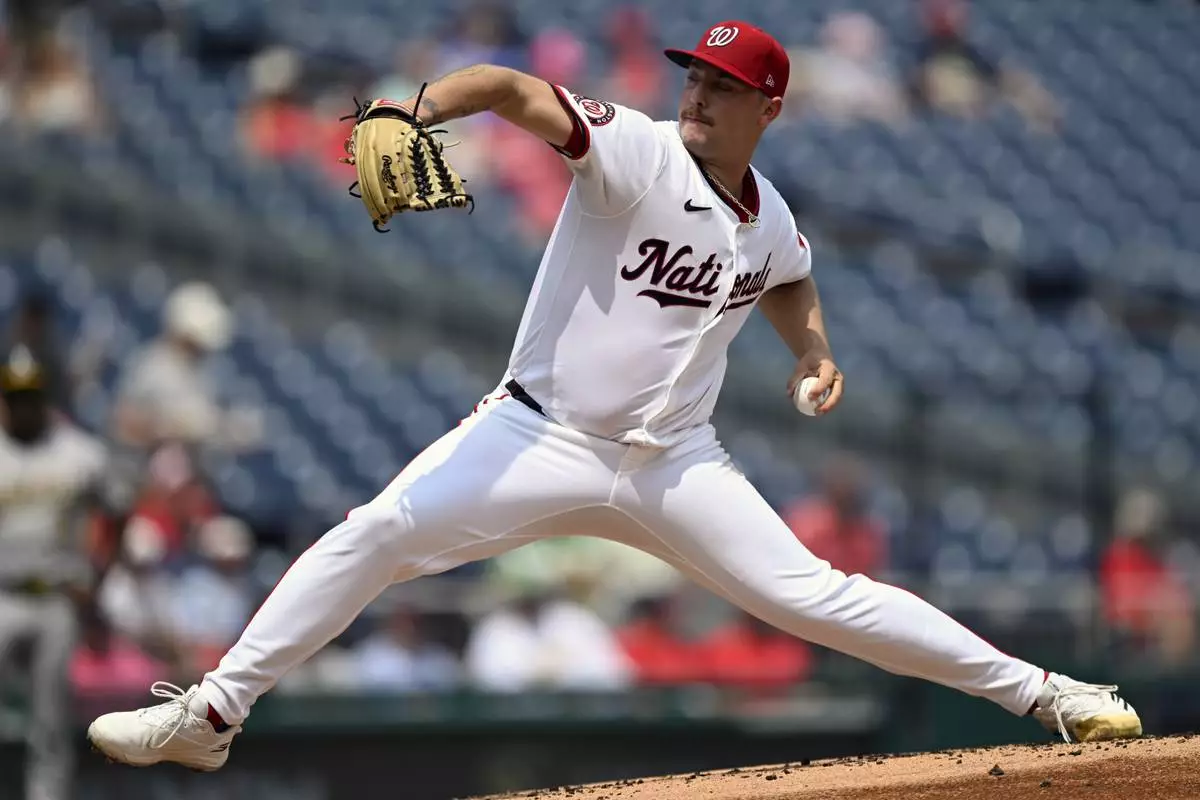 Washington Nationals starting pitcher Mitchell Parker throws during the first inning of a baseball game against the Athletics, Thursday, Aug. 7, 2025, in Washington. (AP Photo/John McDonnell)