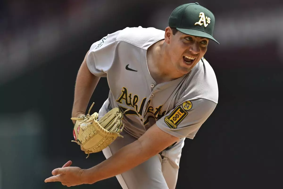 Athletics starting pitcher Jacob Lopez follows through on a pitch during the second inning of a baseball game against the Washington Nationals, Thursday, Aug. 7, 2025, in Washington. (AP Photo/John McDonnell)
