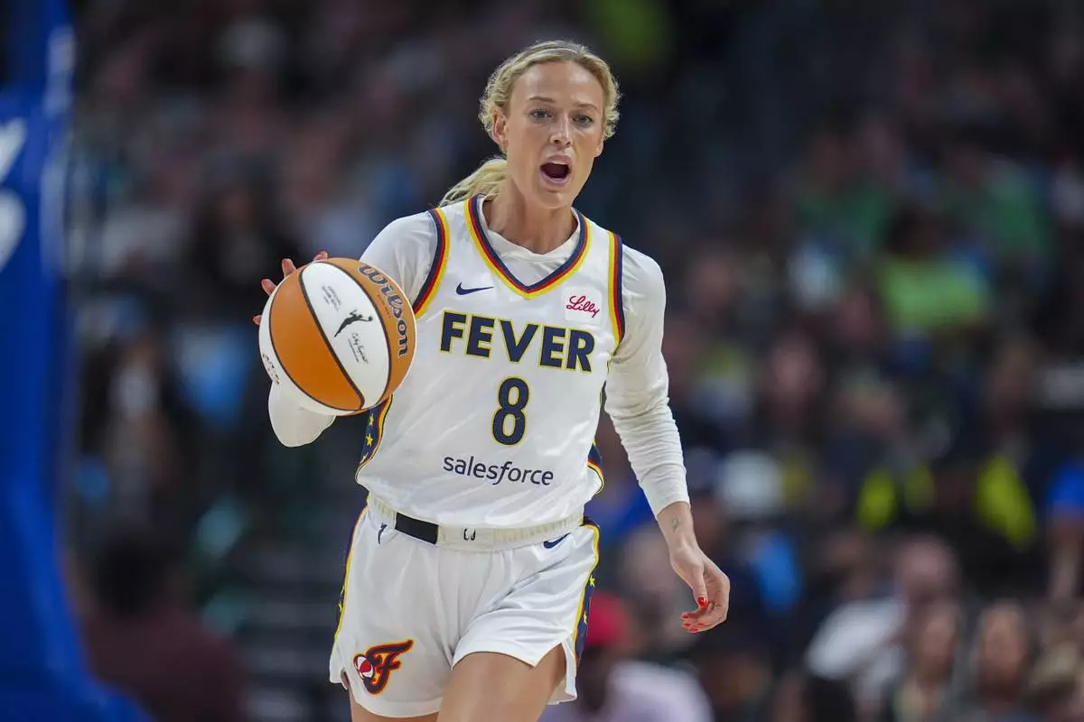Indiana Fever guard Sophie Cunningham dribbles up court against the Dallas Wings during the first half of a WNBA basketball game Friday, Aug. 1, 2025, in Dallas. (AP Photo/Julio Cortez)