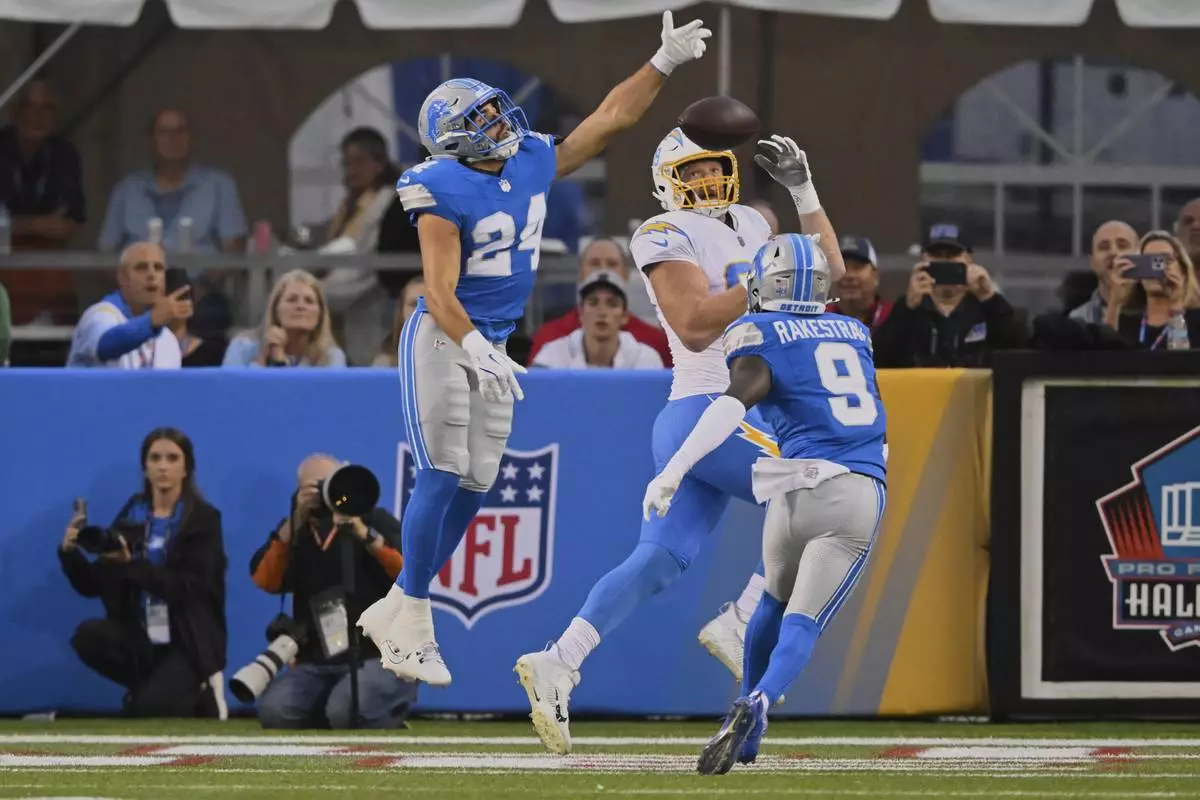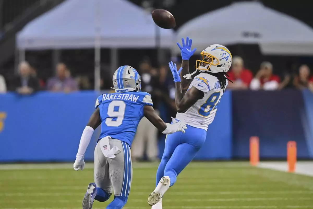 Los Angeles Chargers wide receiver KeAndre Lambert-Smith (84) catches a pass in front of Detroit Lions cornerback Ennis Rakestraw Jr. (9) and Loren Strickland, right, in the first half of the Pro Football Hall of Fame NFL preseason game Thursday, July 31, 2025, in Canton, Ohio. (AP Photo/David Dermer)