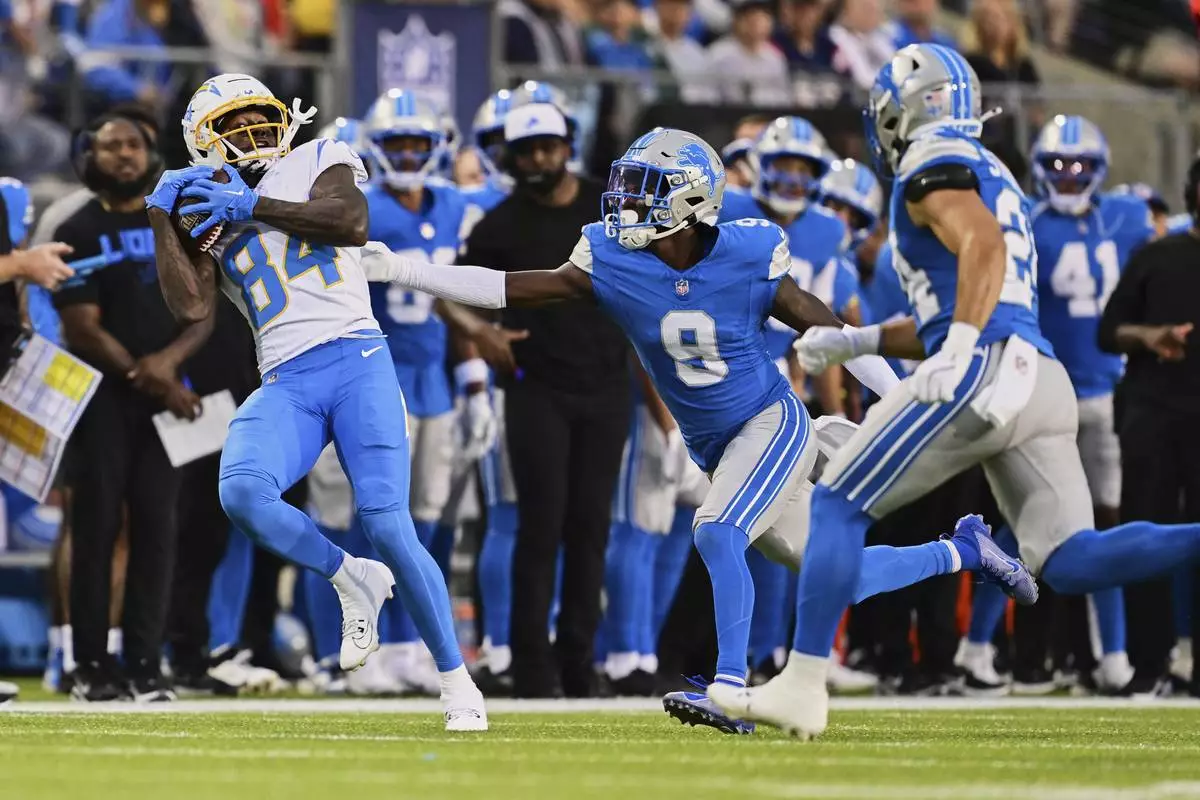 Los Angeles Chargers wide receiver KeAndre Lambert-Smith (84) catches a pass in front of Detroit Lions cornerback Ennis Rakestraw Jr. (9) in the first half of the Pro Football Hall of Fame NFL preseason game Thursday, July 31, 2025, in Canton, Ohio. (AP Photo/David Richard)