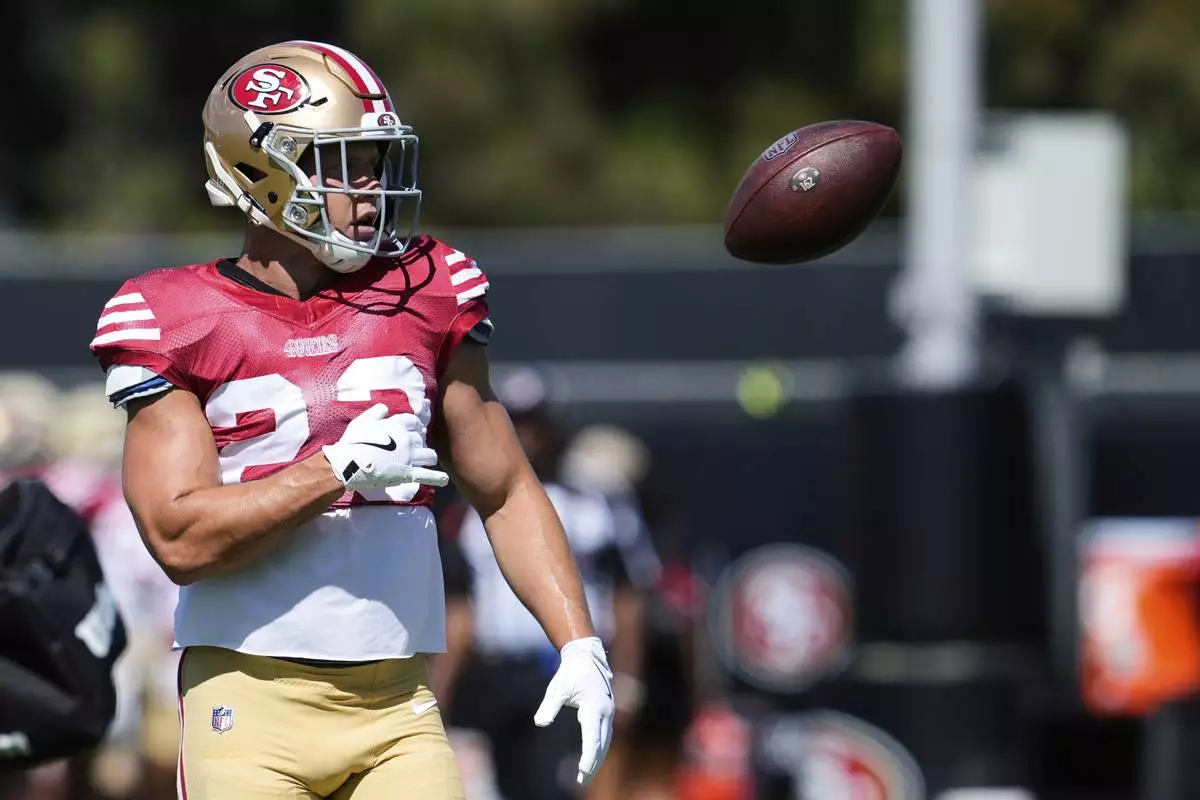 San Francisco 49ers running back Christian McCaffrey tosses the ball during a joint NFL football training camp with the Denver Broncos, Thursday, Aug. 7, 2025, in Santa Clara, Calif. (AP Photo/Godofredo A. Vásquez)