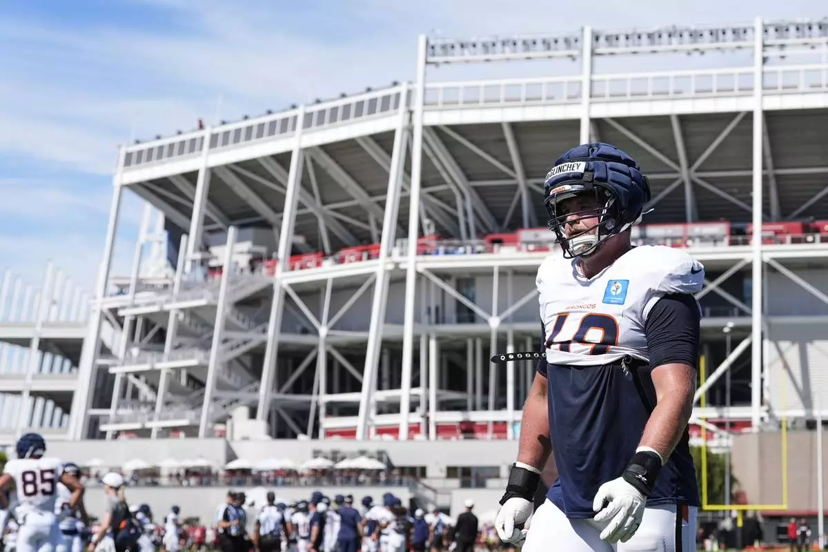 Denver Broncos offensive tackle Mike McGlinchey walks during a joint NFL football training camp with the San Francisco 49ers, Thursday, Aug. 7, 2025, in Santa Clara, Calif. (AP Photo/Godofredo A. Vásquez)