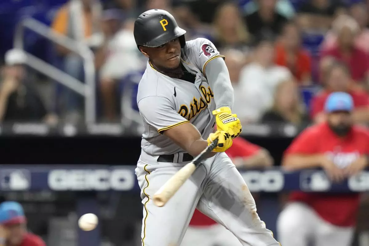 FILE - Pittsburgh Pirates' Ke'Bryan Hayes, recently traded to the Cincinnati Reds, strikes out swinging during the fourth inning of a baseball game against the Miami Marlins, June 24, 2023, in Miami. (AP Photo/Lynne Sladky, File)