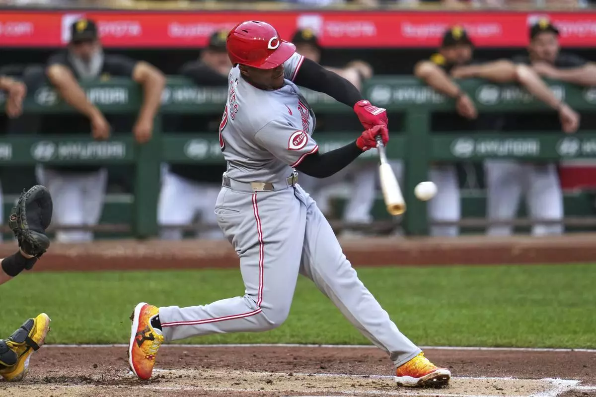 Cincinnati Reds' Ke'Bryan Hayes singles off Pittsburgh Pirates pitcher Paul Skenes during the third inning of a baseball game in Pittsburgh, Thursday, Aug. 7, 2025. (AP Photo/Gene J. Puskar)