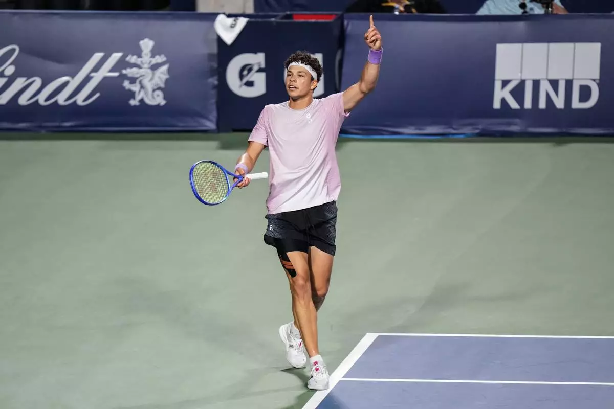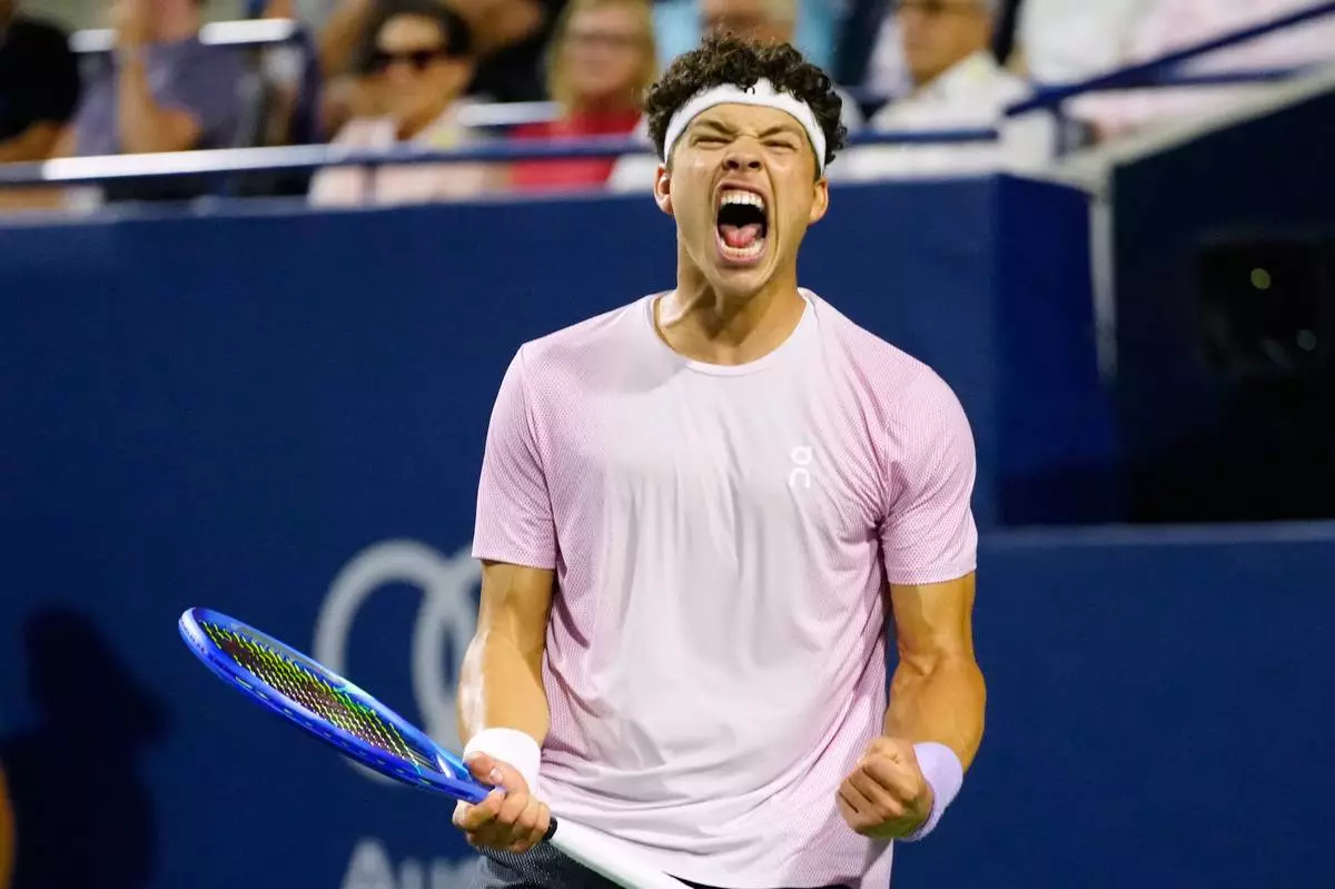 Ben Shelton, of the United States, celebrates after his win over Karen Khachanov, of Russia, in the final match at the National Bank Open men's tennis tournament in Toronto, Thursday, Aug. 7, 2025. (Frank Gunn/The Canadian Press via AP)