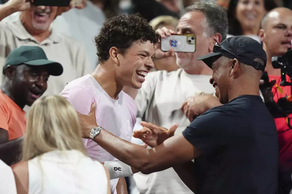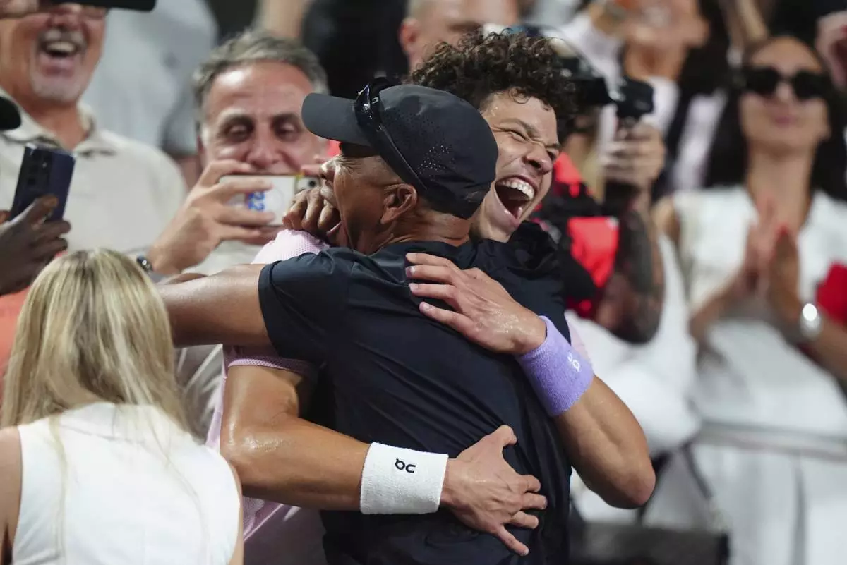 Ben Shelton, center, of the United States, celebrates after his win over Karen Khachanov, of Russia, with his father Bryan Shelton, right, after the final match at the National Bank Open men's tennis tournament in Toronto, Thursday, Aug. 7, 2025. (Frank Gunn/The Canadian Press via AP)