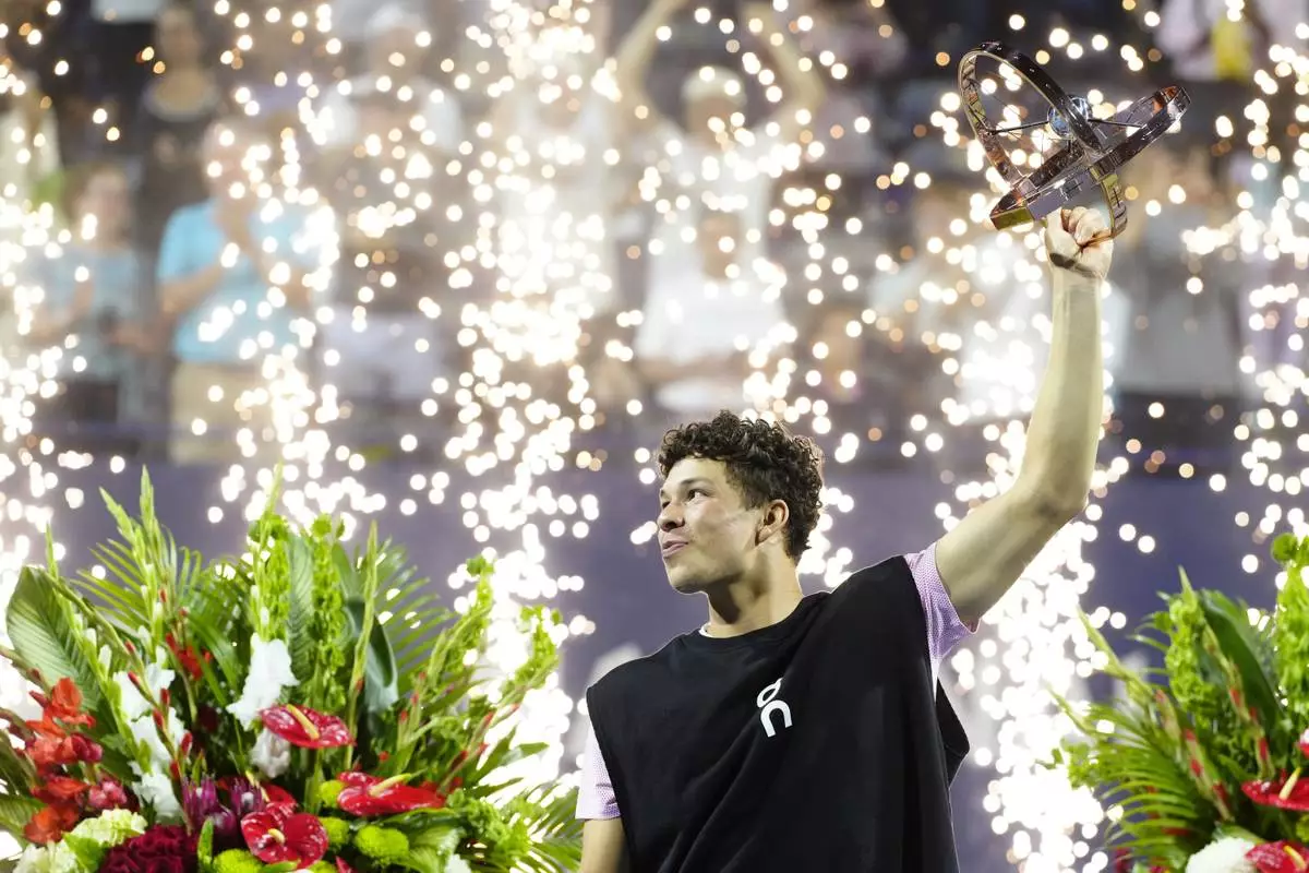 Ben Shelton, of the United States, lifts the trophy as he celebrates after his win over Karen Khachanov, of Russia, in the final match at the National Bank Open men's tennis tournament in Toronto, Thursday, Aug. 7, 2025. (Frank Gunn/The Canadian Press via AP)