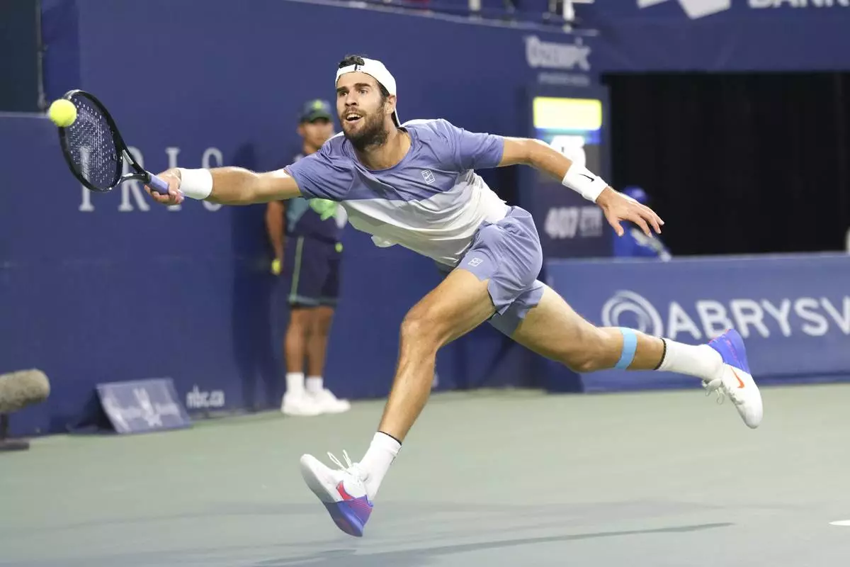 Karen Khachanov, of Russia, returns to Ben Shelton, of the United States, during the men's final at the National Bank Open tennis tournament in Toronto, Thursday, Aug. 7, 2025. (Chris Young/The Canadian Press via AP)
