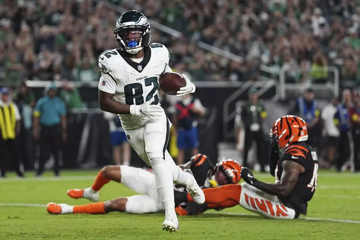 Philadelphia Eagles wide receiver Ainias Smith (82) scores a touchdown during the first half of an NFL preseason football game against the Cincinnati Bengals on Thursday, Aug. 7, 2025, in Philadelphia. (AP Photo/Matt Rourke)