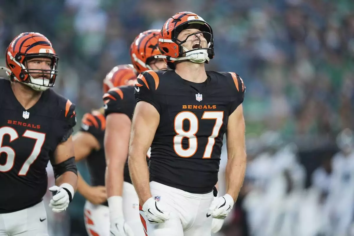 Cincinnati Bengals tight end Tanner Hudson (87) reacts after an extra point following his touchdown during the first half of an NFL preseason football game against the Philadelphia Eagles on Thursday, Aug. 7, 2025, in Philadelphia. (AP Photo/Chris Szagola)
