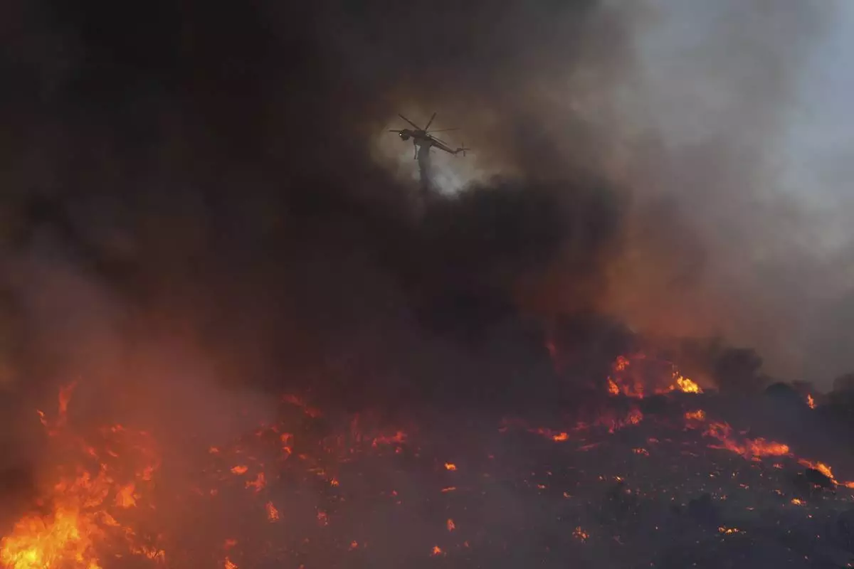 A helicopter drops water over the Canyon Fire on Thursday, Aug. 7, 2025, in Halsey Canyon, Calif. (AP Photo/Marcio Jose Sanchez)