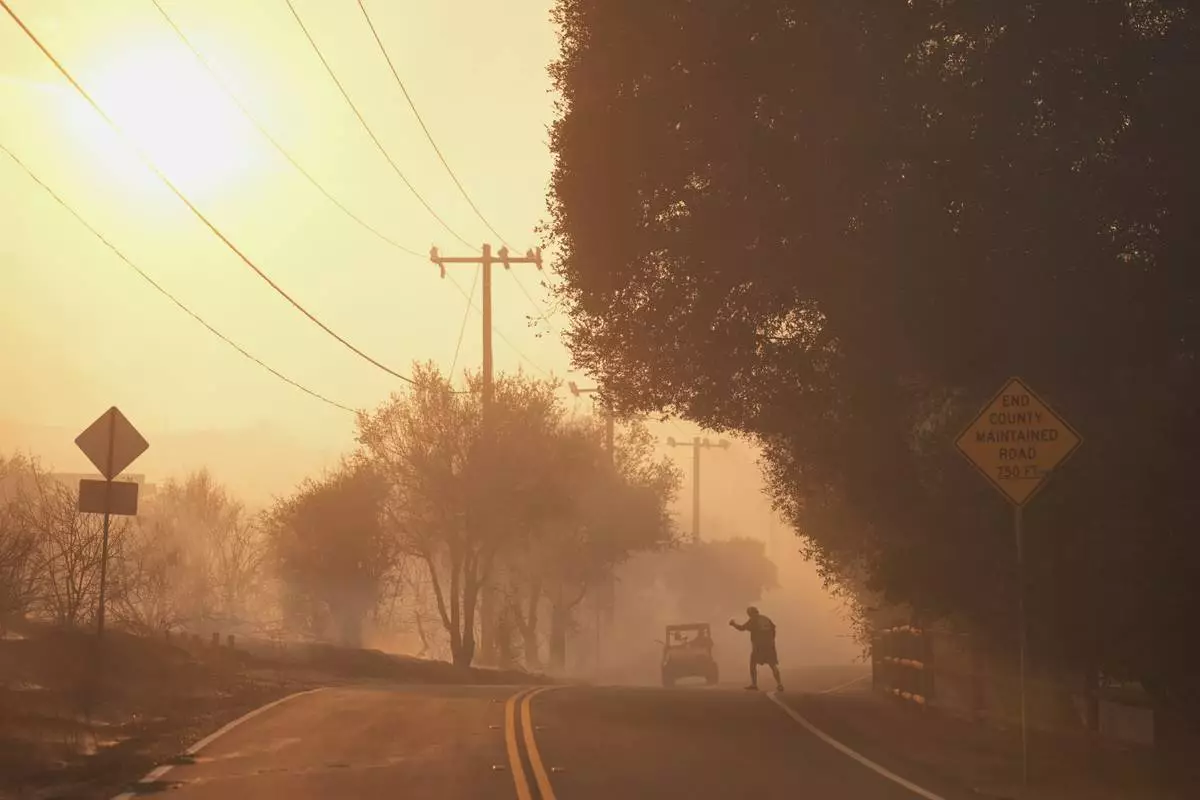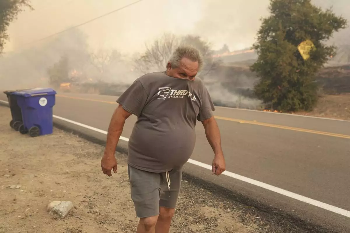 A resident walks along Halsey Canyon Road as the Canyon Fire burns on Thursday, Aug. 7, 2025, in Halsey Canyon, Calif. (AP Photo/Marcio Jose Sanchez)