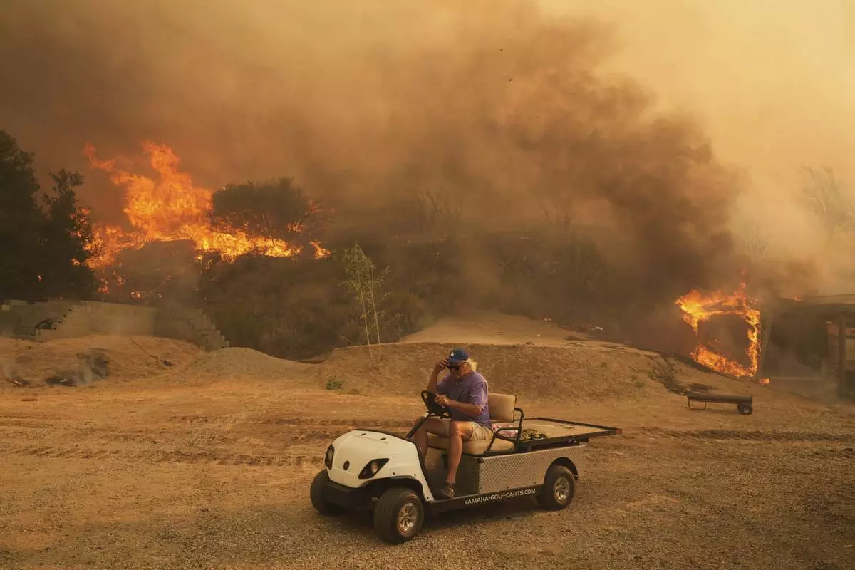 A resident rides a golf cart as he exits his property while the Canyon Fire burns on Thursday, Aug. 7, 2025, in Halsey Canyon, Calif. (AP Photo/Marcio Jose Sanchez)