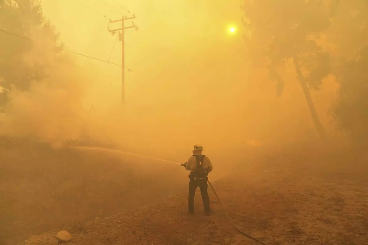 A firefighter battles the Canyon Fire on Thursday, Aug. 7, 2025, in Halsey Canyon, Calif. (AP Photo/Marcio Jose Sanchez)