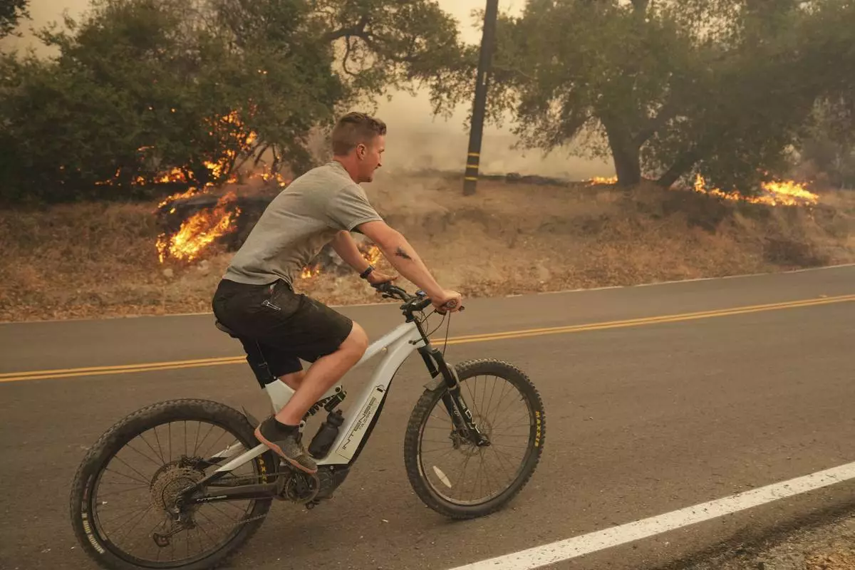 A resident rides a bike along Halsey Canyon Road as the Canyon Fire burns on Thursday, Aug. 7, 2025, in Halsey Canyon, Calif. (AP Photo/Marcio Jose Sanchez)