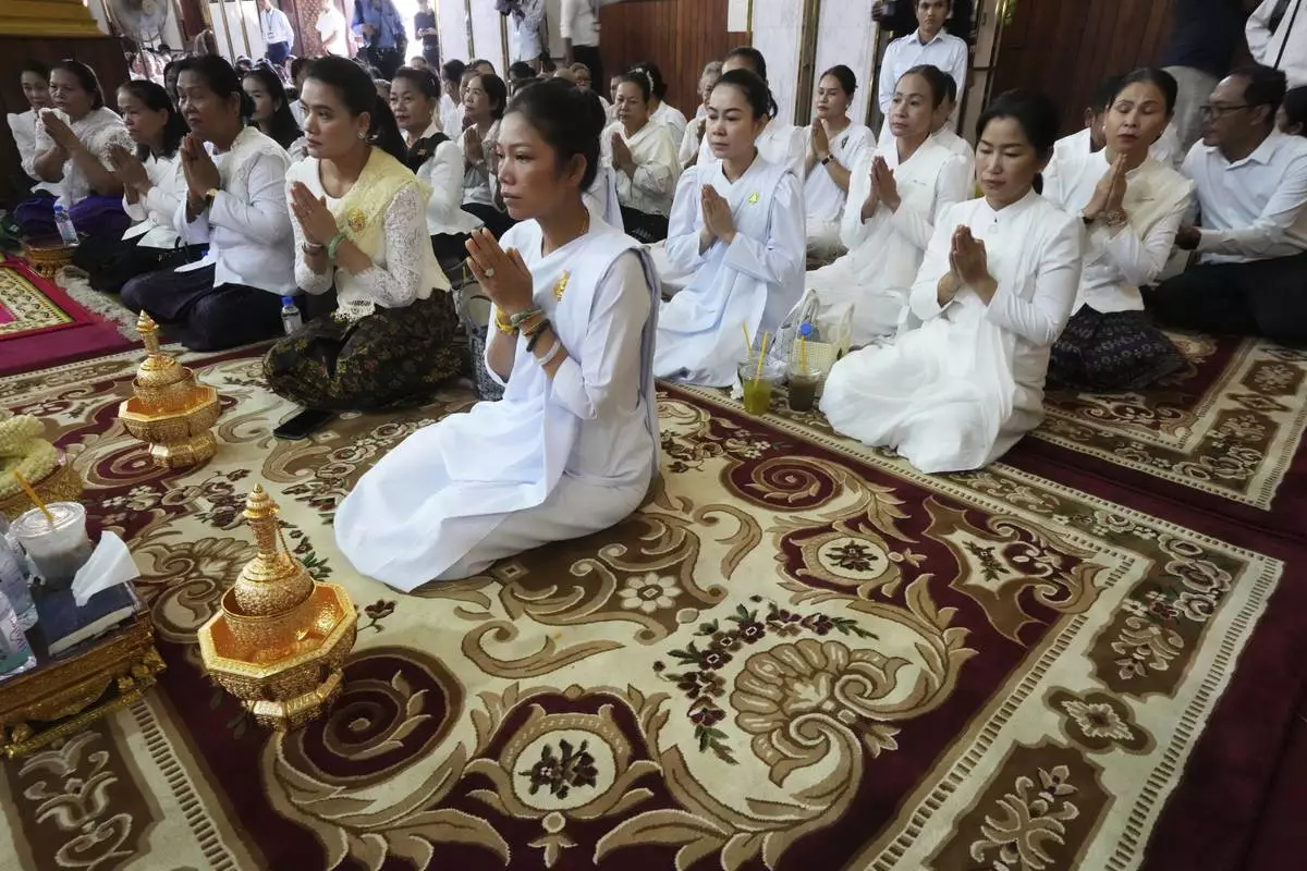 Cambodian Buddhist followers offer prayers to the remains of the soldiers who sacrificed their lives in battles with Thai troops along the disputed border areas, at a Buddhist pagoda of Wat Botumvotey in Phnom Penh, Cambodia, Friday, Aug. 8, 2025. (AP Photo/Heng Sinith)