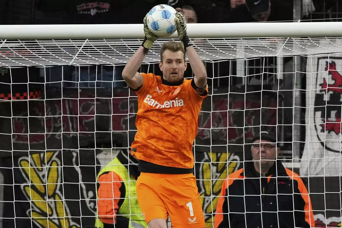 FILE - Leverkusen's goalkeeper Lukas Hradecky saves the ball during the German Bundesliga soccer match between Bayer Leverkusen and St. Pauli at the BayArena in Leverkusen, Germany, Saturday, Dec. 7, 2024. (AP Photo/Martin Meissner, File)