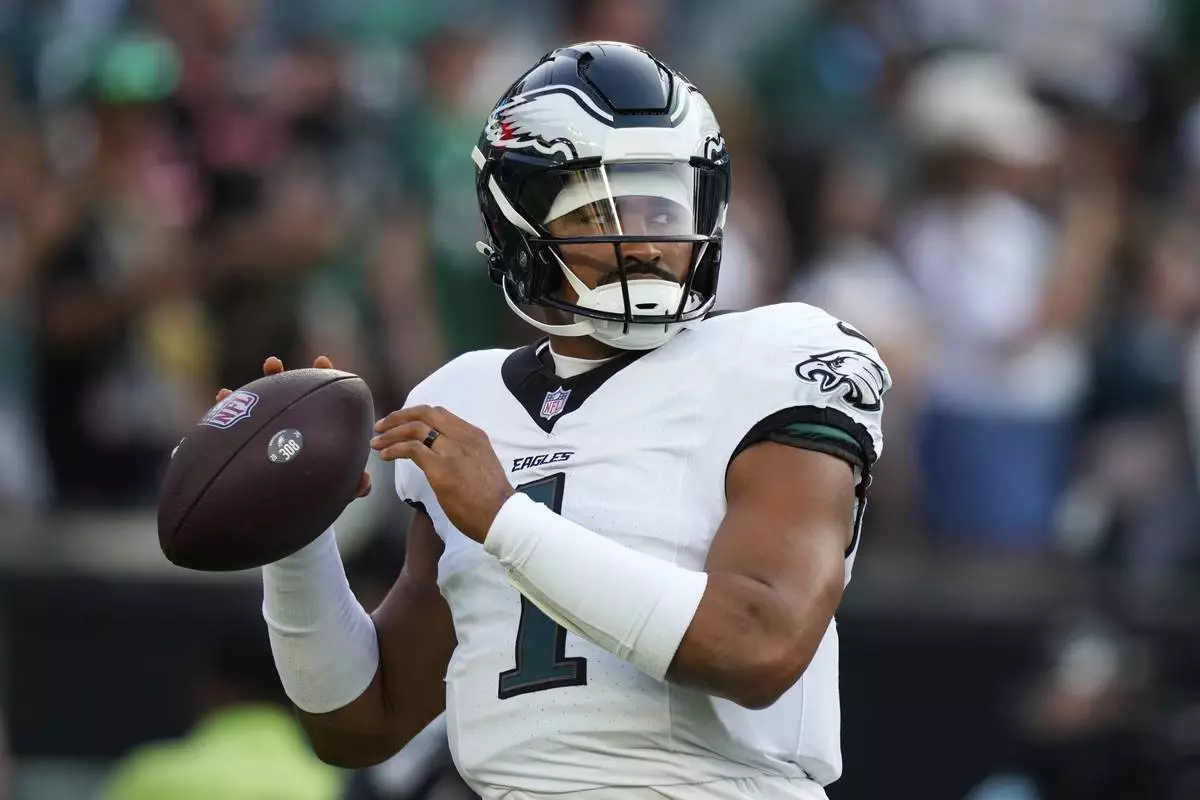 Philadelphia Eagles quarterback Jalen Hurts warms up before an NFL preseason football game against the Cincinnati Bengals on Thursday, Aug. 7, 2025, in Philadelphia. (AP Photo/Matt Slocum)