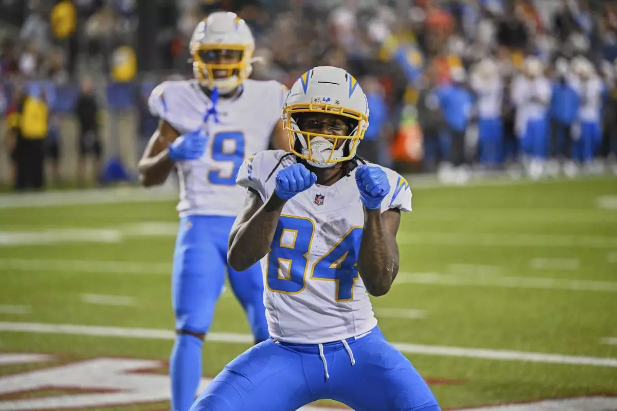 Los Angeles Chargers wide receiver KeAndre Lambert-Smith (84) celebrates his touchdown in the first half of the Pro Football Hall of Fame NFL preseason game against the Detroit Lions, Thursday, July 31, 2025, in Canton, Ohio. (AP Photo/David Richard)