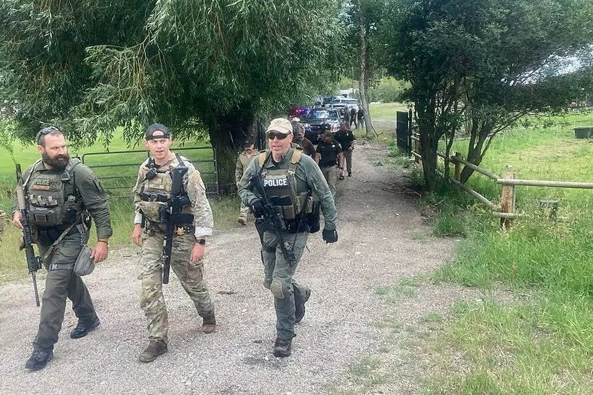 Law enforcement officers are seen at the scene where Michael Brown, a suspect in a shooting at a Montana bar that left four people dead, was apprehended on Friday, Aug. 8, 2025, outside of Anaconda, Mont. (Duncan Adams/The Montana Standard via AP)
