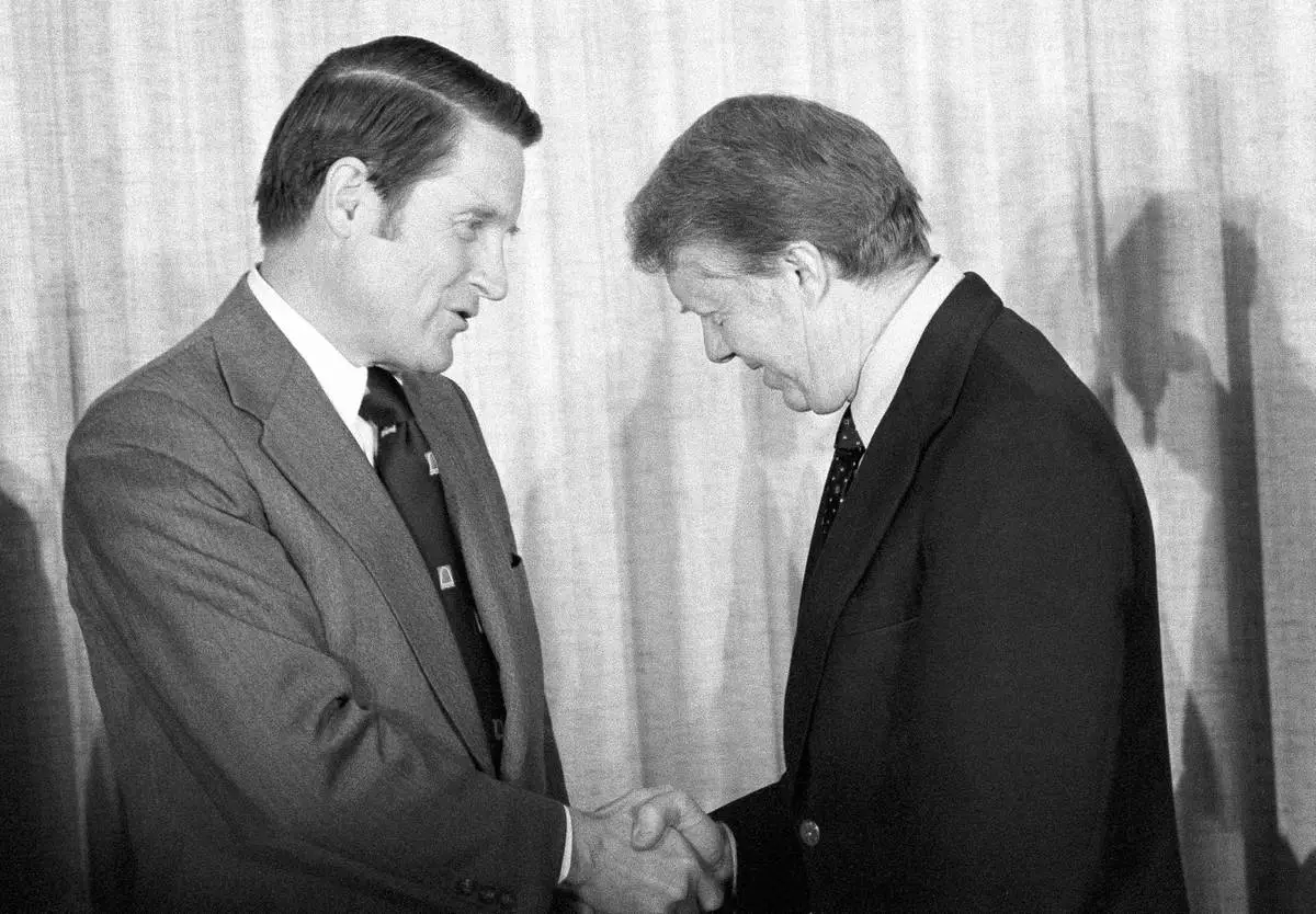 FILE - William H. Webster, left, is congratulated by President Jimmy Carter after being sworn in as new director of the FBI in Washington, Feb. 23, 1978. (AP Photo/Harvey Georges, File)