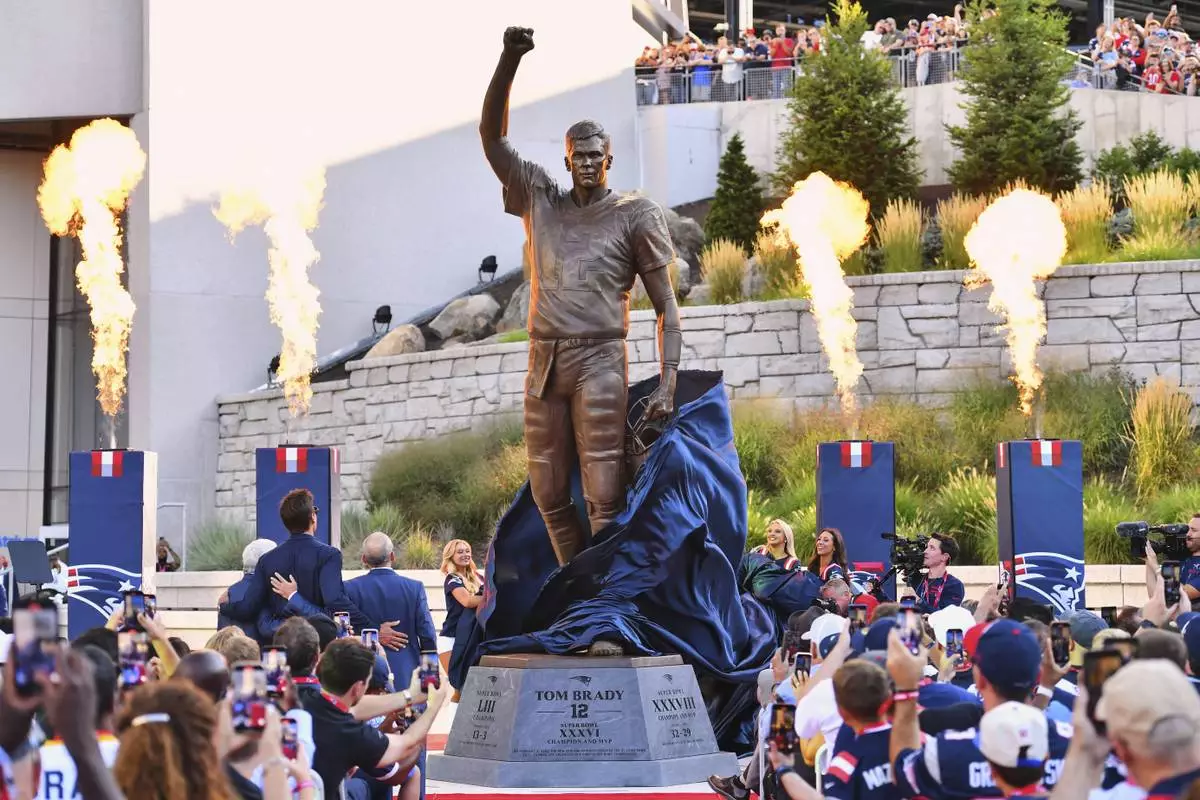 FOXBOROUGH, Mass. (AP) — Tom Brady's statue weighs six tons and rises 17 feet off the ground, from the bottom of the six-sided base — one for each of the New England Patriots' Super Bowl victories — to the tip of the bronze fist raised in celebration.