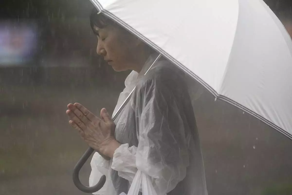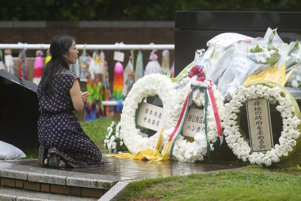 A woman offers prayer in the rain at the Atomic Bomb Hypocenter Park, as Japan commemorates the 80th anniversary of the day an atomic bomb was dropped on its southwestern city, in Nagasaki, Japan Saturday, Aug. 9, 2025.(AP Photo/Eugene Hoshiko)