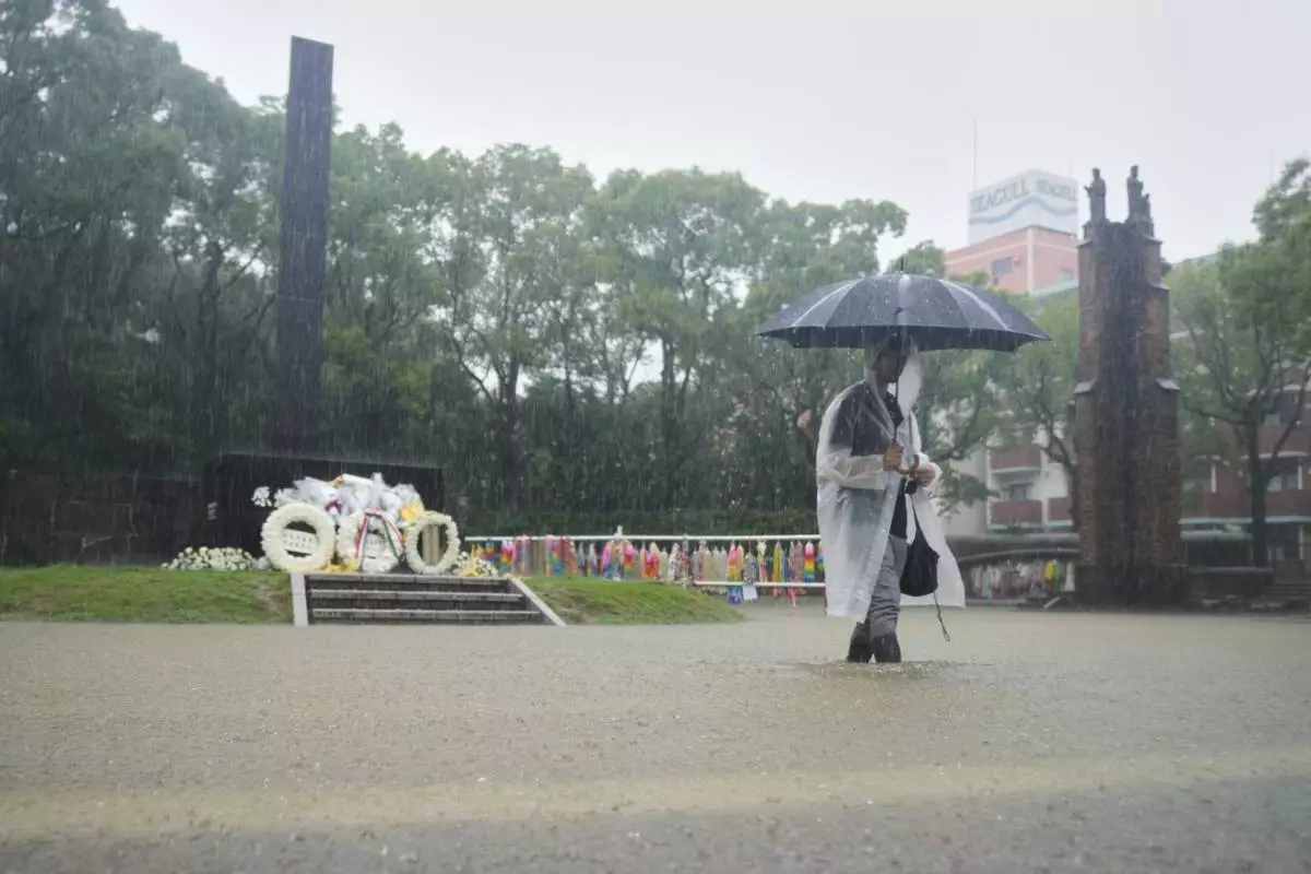 Survivors and their families gathered Saturday in rainy weather at Peace Park and nearby Hypocenter Park, located below the bomb’s exact detonation spot, hours before the official ceremony.