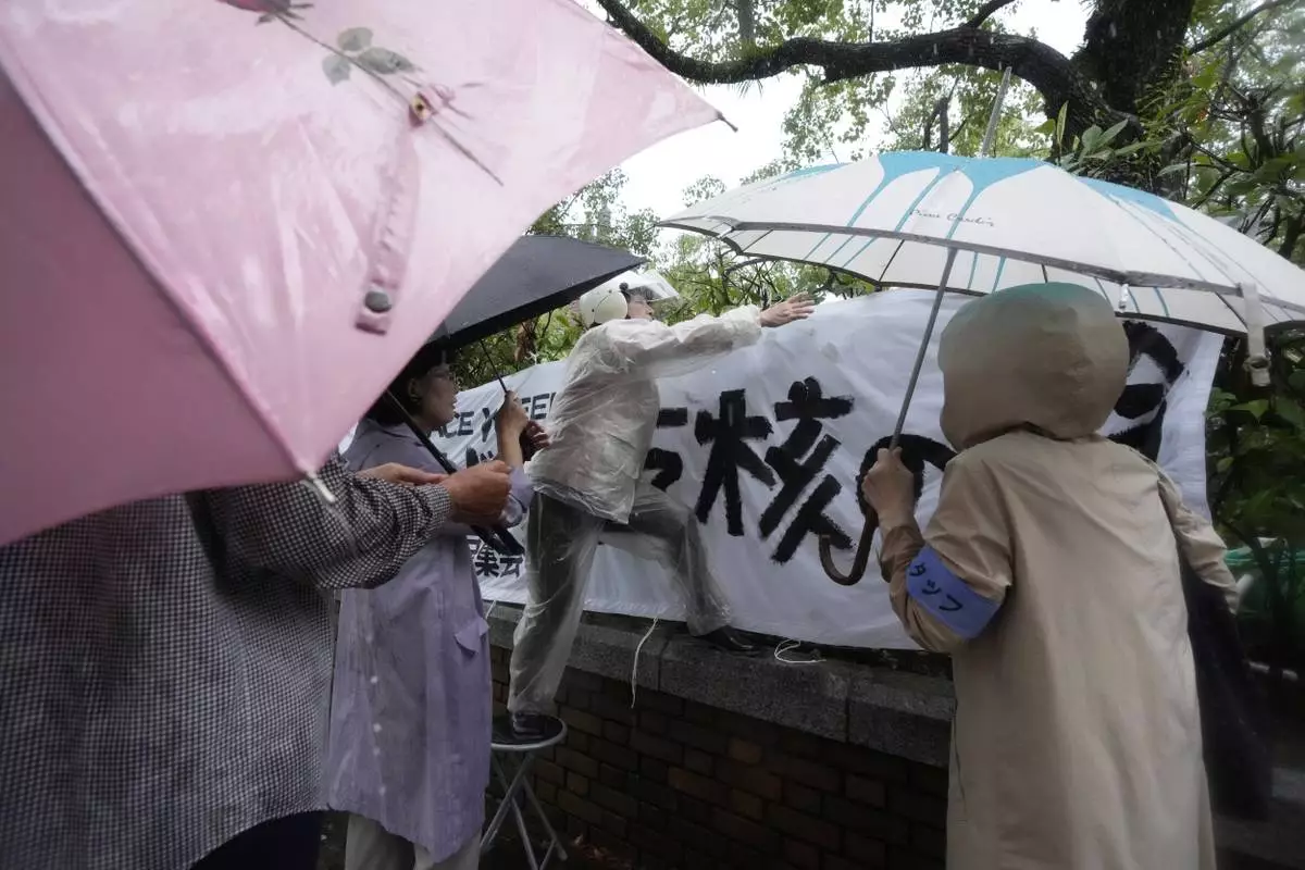 People put up a banner, ahead of a public ceremony to commemorate the 80th anniversary of the day an atomic bomb was dropped on Nagasaki, at the Atomic Bomb Hypocenter Park in Nagasaki, Japan Saturday, Aug. 9, 2025. The banner, partly seen, reads: "Nuclear." (AP Photo/Eugene Hoshiko)