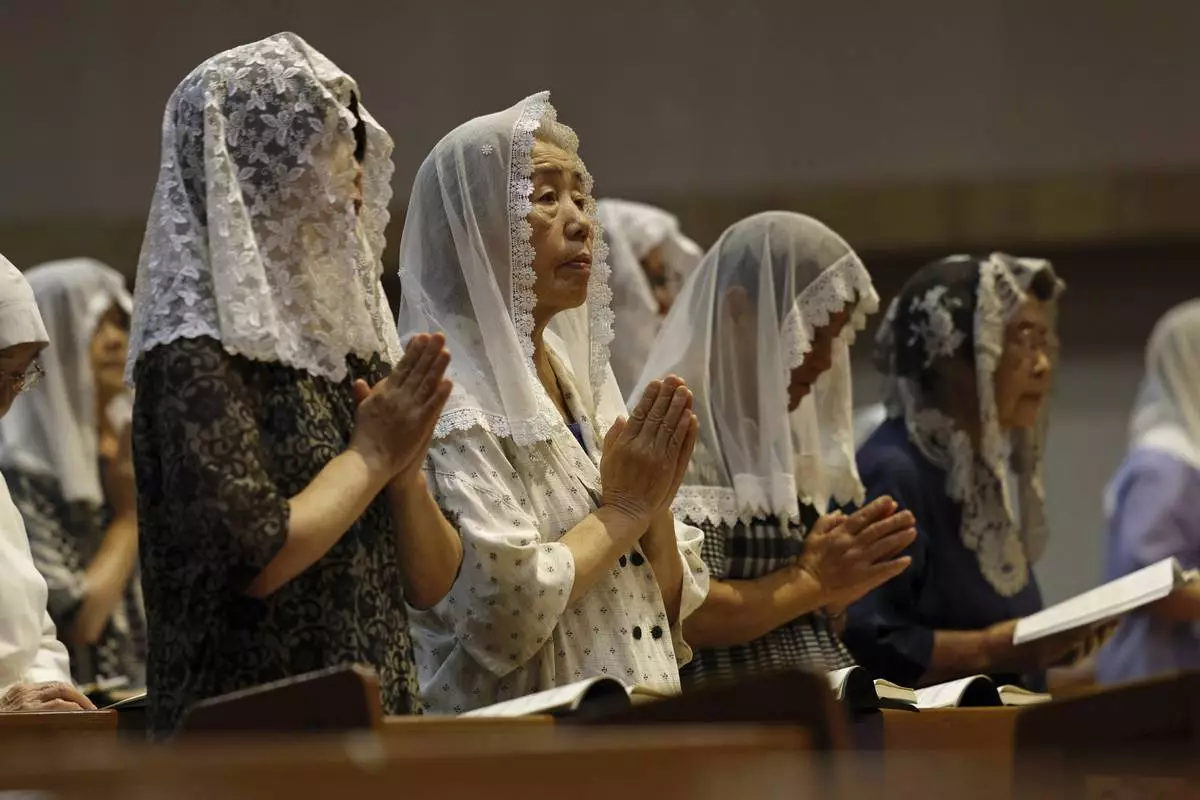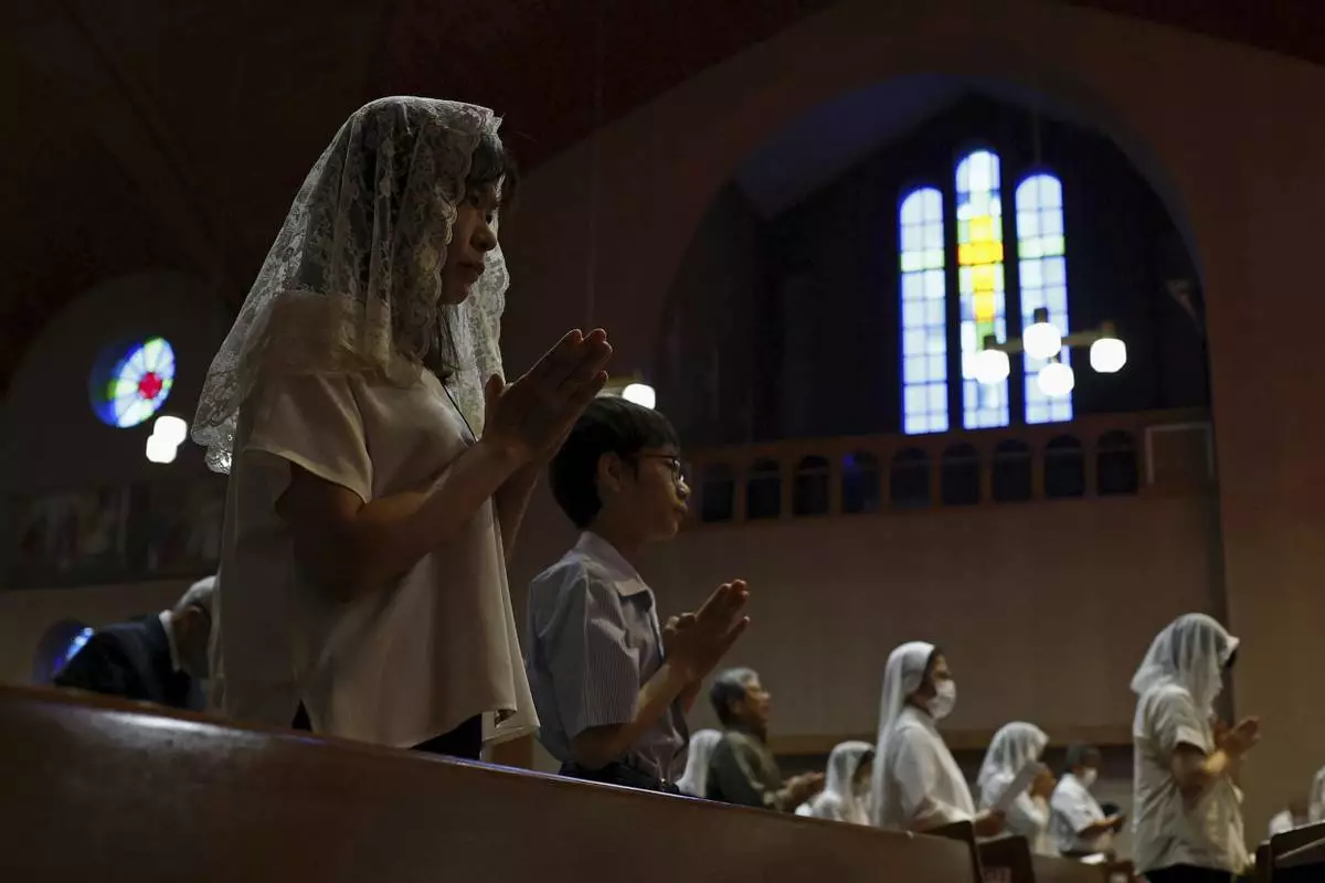 Faithful people offer prayers at the Urakami Cathedral in Nagasaki Saturday, Aug. 9, 2025, marking the 80th anniversary of the U.S. atomic bombing of the southwestern Japanese city. (Kyodo News via AP)