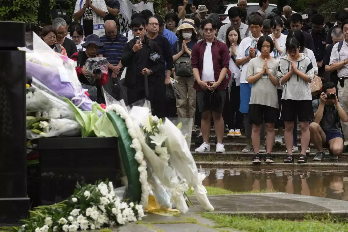 People offer prayers at the Atomic Bomb Hypocenter Park, during a ceremony to commemorate the 80th anniversary of the day an atomic bomb was dropped on Japanese southwestern city, in Nagasaki, Japan Saturday, Aug. 9, 2025.(AP Photo/Eugene Hoshiko)