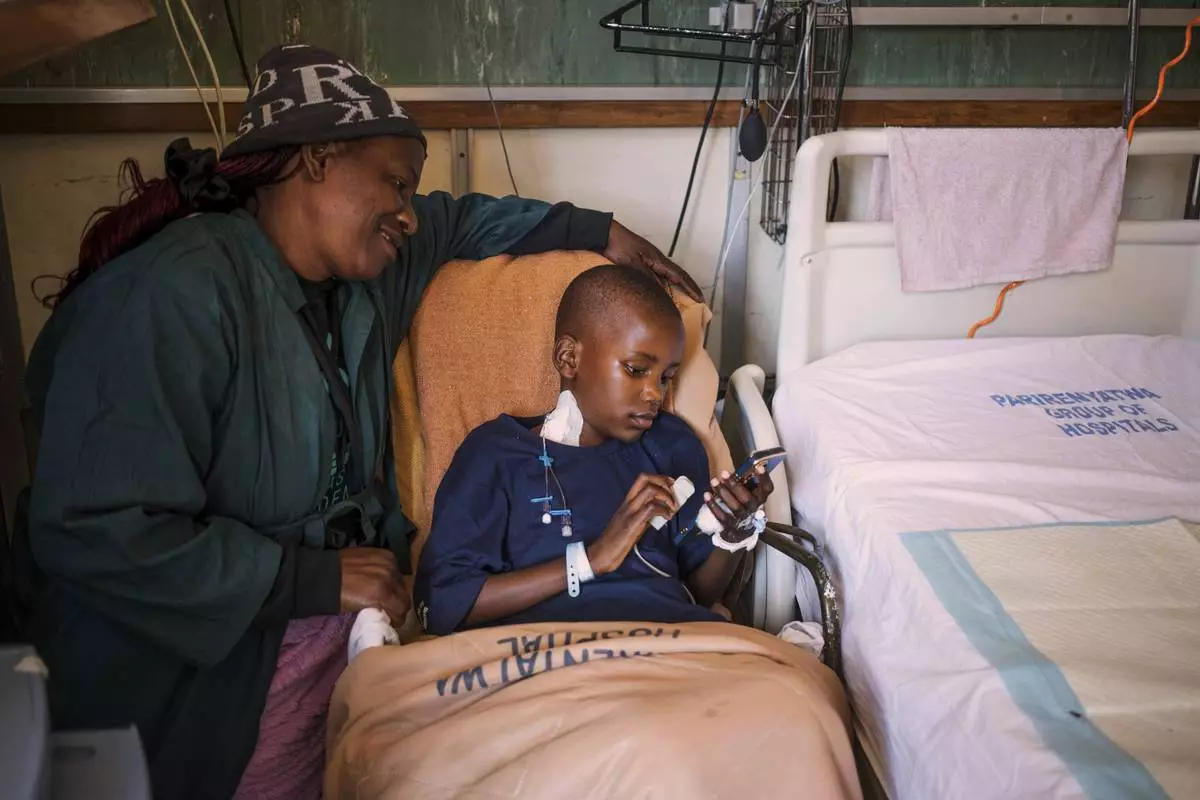Violet Petro watches her 9 year-old son Ethan Goronga playing games on a mobile phone as he recovers from an open-heart surgery at Parirenyatwa Hospital, Harare, Zimbabwe, Thursday, July 17, 2025. (AP Photo/Aaron Ufumeli)