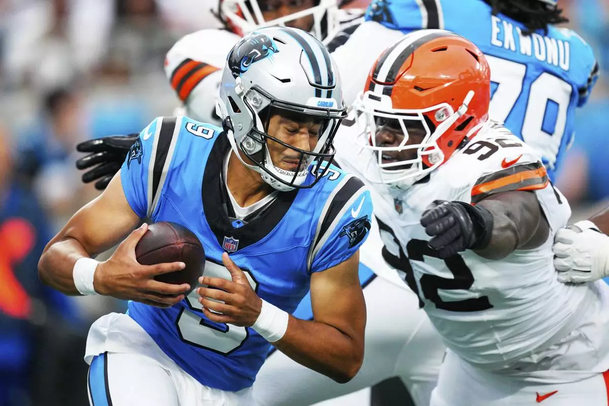 Carolina Panthers quarterback Bryce Young breaks away from Cleveland Browns defensive end Sam Kamara during the first half of a preseason NFL football game on Friday, Aug. 8, 2025, in Charlotte, N.C. (AP Photo/Jacob Kupferman)